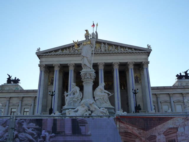 ギリシャのパルテノン神殿を思わせる国会議事堂はフェンスで囲まれ、立入禁止・見学不可の処置が取られていました。