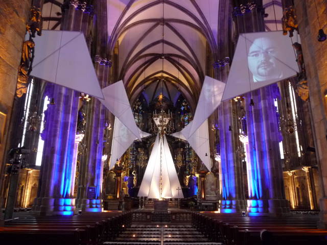 当日は照明とプロジェクターを使って、何かの催し(芸術的個展? それとも社会的な呼びかけ?)が行われていました。
