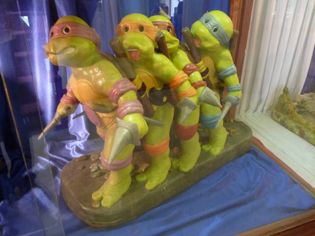 左はご存じ忍者タートルズ。身長は60〜70cmくらいあります。