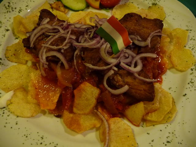 スパイシーソースたっぷりって言ったら、本当に辛かった! でも旨い! ボリューム満点で、お値段600HUF。