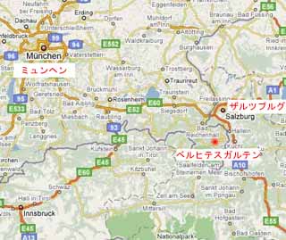 ケールシュタインハウスの近くには、見学可能な岩塩鉱山もあります。 ベルヒテスガルテンはドイツですが、ミュンヘンから約185km。 ザルツブルグからは約25kmと近く、市バスでも1時間ほどで行けます。 ←Googleマップ。ザルツブルグの南、赤い点がベルヒテスガルテン。 ミュンヘンは地図左上。 |