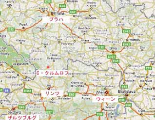 ←Googleマップ。リンツの北、赤い点がC・クルムロフ。プラハはその遥か北、 ザルツブルグは左下。 |