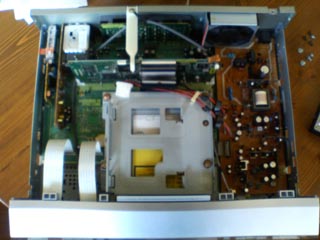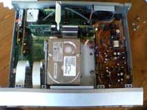 中央がHDD、右側の茶色の基盤が電源部、左上が留守録などを制御するメモリ。