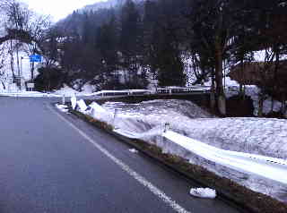 雪の重みで曲がったガードレール。車がぶつかってもこんなにはならないだろうというくらいグニャグニャに曲がっている。