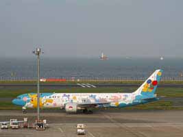 右:ポケモンカラーの全日空機
