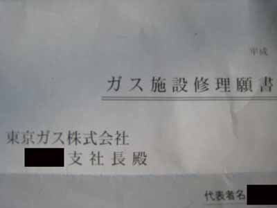 タイトルは「ガス施設修理願書・東京ガス支社長殿」、