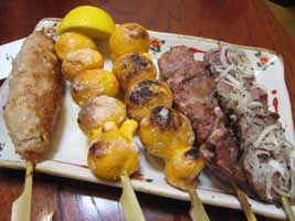 つき出しと各種焼鳥。左から、つくね、きんかん、レバー、ハツ。