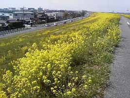 満開の菜の花。数kmに渡ってこんな光景が広がっていました。↓右は「海まで38km」の標識あたりで撮影。