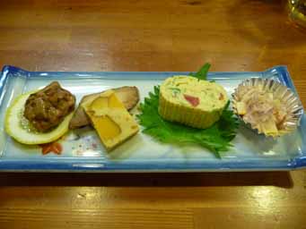 左上から時計回りに、つき出し、焼き物、鶏の塩辛、鶏皮のキムチ。