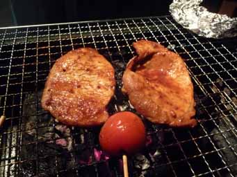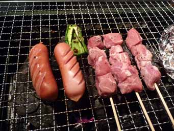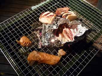 夕食はお約束のバーベキュー。鮭、イカ、ホタテ、サザエ、豚のカシラ、ホルモン、ソーセージ等々を焼いて食べました。