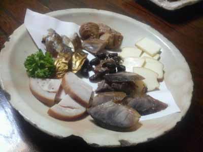 左上から時計回りに、鯨の刺身@1000円、〆鯖@800円、自家製魚介の燻製@1000円、皮はぎの刺身@1500円。