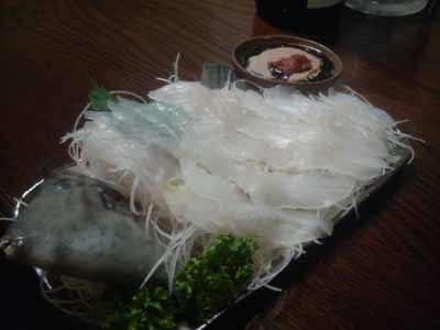 肝醤油で頂く皮はぎがウルトラ美味! この他にも稚鮎の塩焼き×2@1000円なども頂きました。