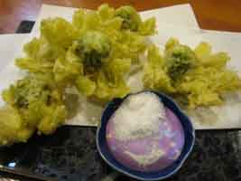 蕗の薹の天ぷらと鶏の塩辛。