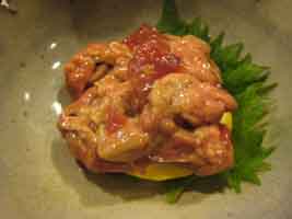 右)右奥はポン酢で頂くレバ刺し、手前はキンカン。