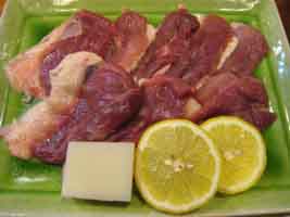 右)鴨鍋の肉。これをしゃぶしゃぶのように、半生で頂きます。