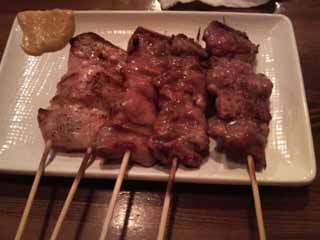 左)こめかみ、ハツ、タン、ピートロ。最後にシロ(皮)が供される5串盛りが900円。高い!