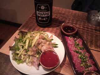 オススメは、ホルモン9品盛りとトン足。美味! この後も、ホルモン3品盛り等を追加してホッピーをグビグビ。