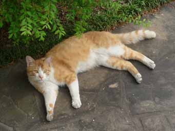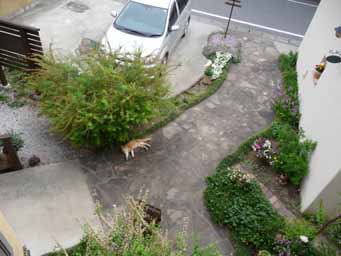 ベランダから何気なく下を見たら、玄関前のアプローチに隣家の猫(ノラ猫?)が寝ているではありませんか!