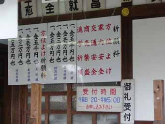 左は祈願料金表。月イチ祈願なら5000円、毎日祈願なら10000円、特別祈願は30000〜50000円。