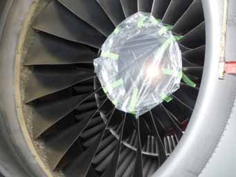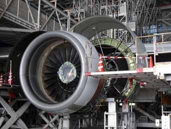 高さ10m以上のB747の垂直尾翼と、直径3m以上もあるB777のエンジン。ファンブレードはチタン製。