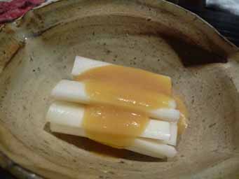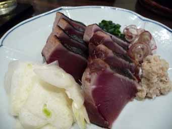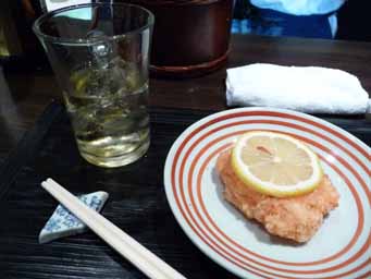 お通しが海老しんじょ揚げ、その他に初鰹、いぶし牛、ウドの酢味噌和えを注文。