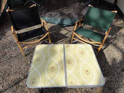 カーミットチェアーとアウトレットで買ったコールマンのローテーブル、それと先日購入したアルパカのコンパクト石油ストーブです。
