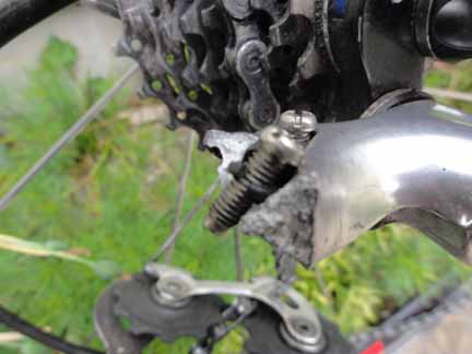 再びプーリーにチェーンが絡まる音がしたと同時に、ディレイラーがネジ部分からポッキリ折れてしまいました!!