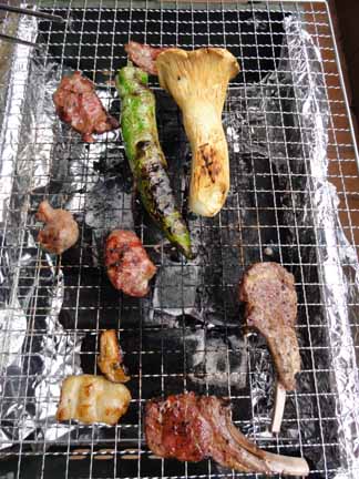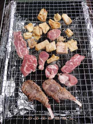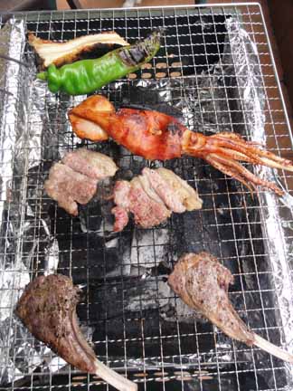 今回の材料は、ラムチョップ、豚かしら、ホルモン、牛カルビに、エリンギや巨大ししとう、イカの丸焼きまで!