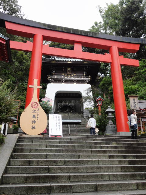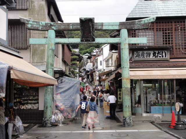 満腹になった後は島内観光。青銅の鳥居から参道を歩いて江島神社へ。