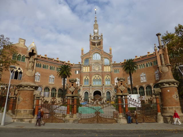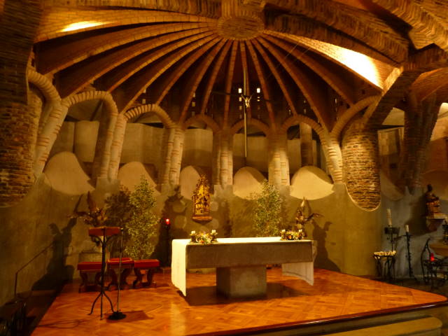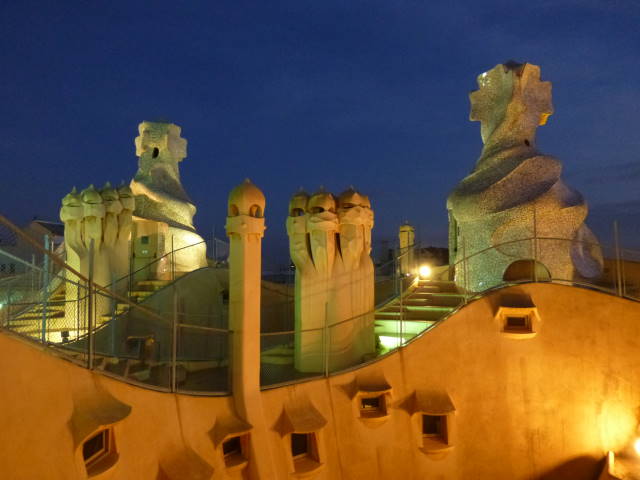 左上から時計回りに、コロニア・グエル教会の地下礼拝堂、夜のカサ・ミラの屋上、サン・パウ病院の正面全景、