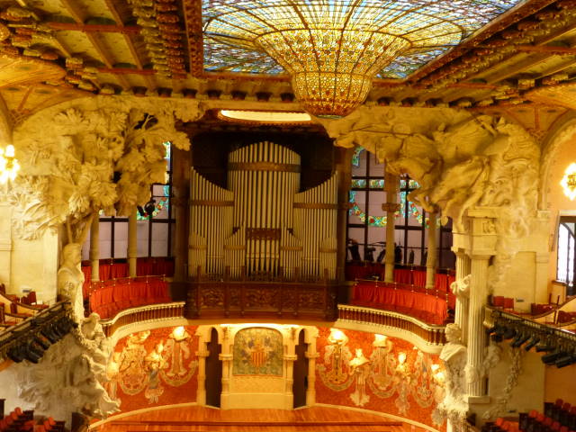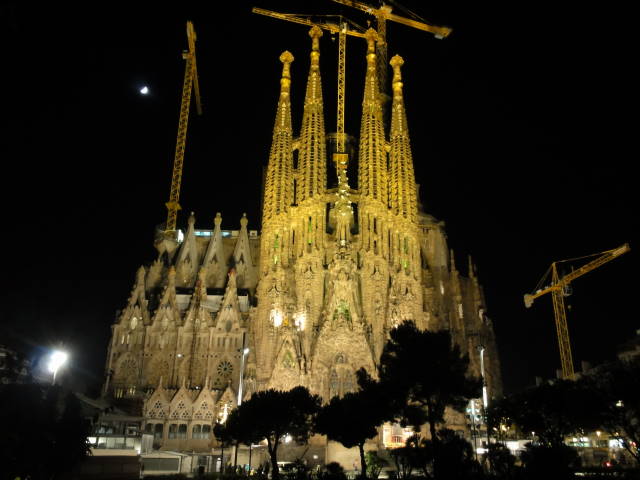 カタルーニャ音楽堂のコンサートホール、カサ・バトリョの広間のステンドグラス、サグラダ・ファミリアの夜景。