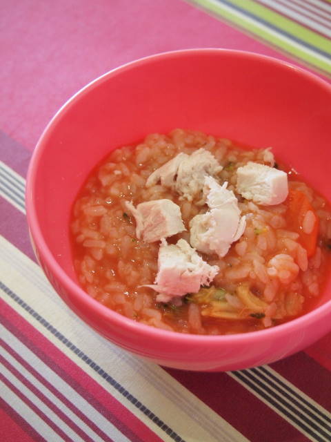 左は初来店の犬に提供される御飯。クレア♀は人が食事をしている間、足元に座って待っている訓練。
