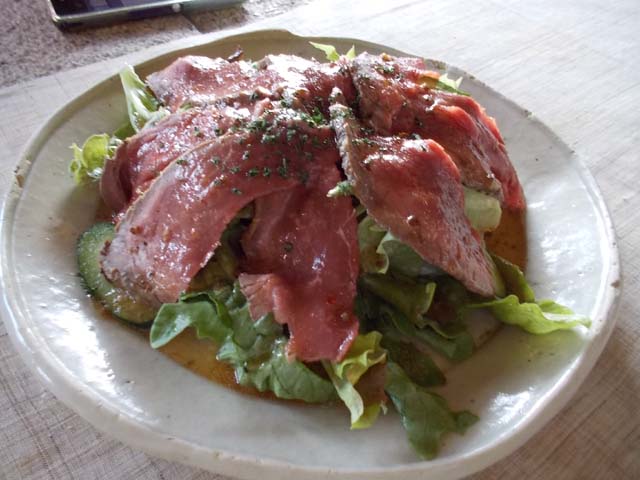 左は来店者のほぼ100%が注文する、ローストビーフサラダ@1050円。