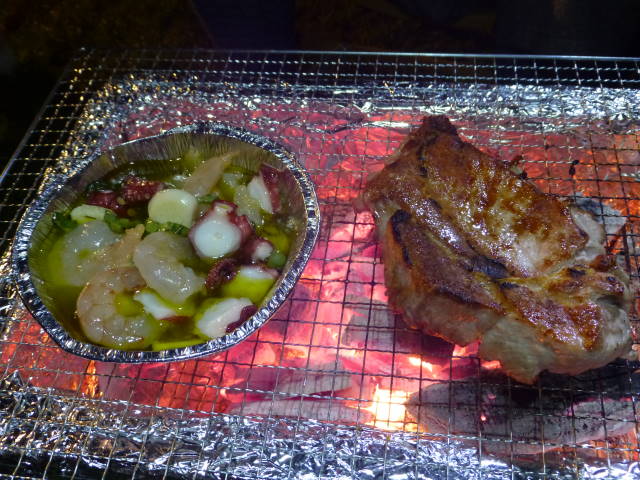 今回の当たりは、タコとエビのアヒージョと、厚切り豚肉のステーキ。
