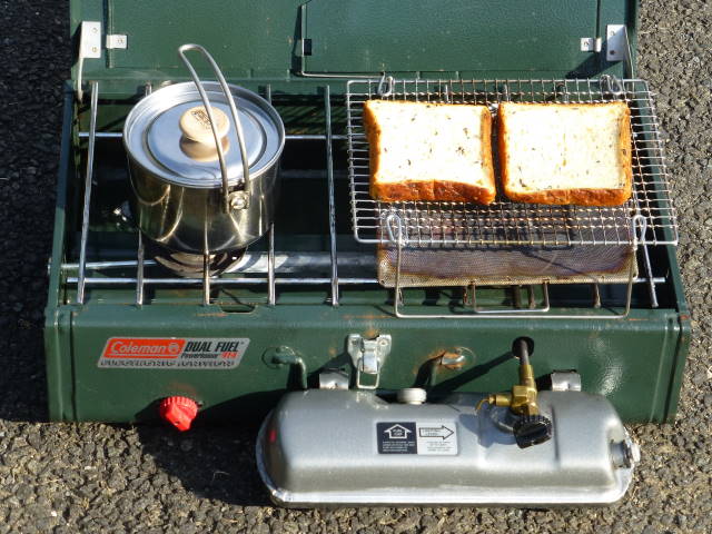 翌日も朝から快晴。先日メンテした2バーナーを使って、トーストとスープの朝食。