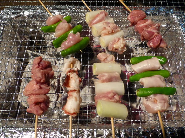 今日のメインは、鶏肉と豚カシラ肉とタコの串焼き。