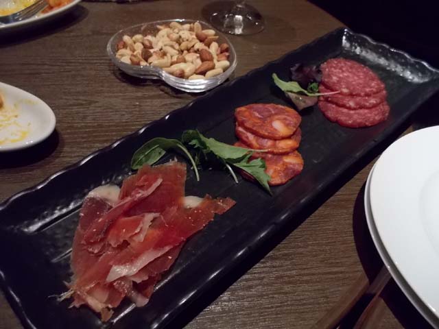 生ハム&サラミのセットとアヒージョで、白ワインをグビグビ。