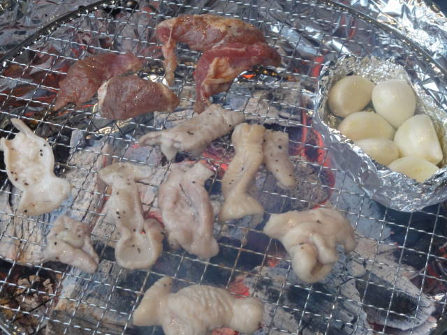 そこで自宅のウッドデッキで、炭火でホルモン焼いて食べました。