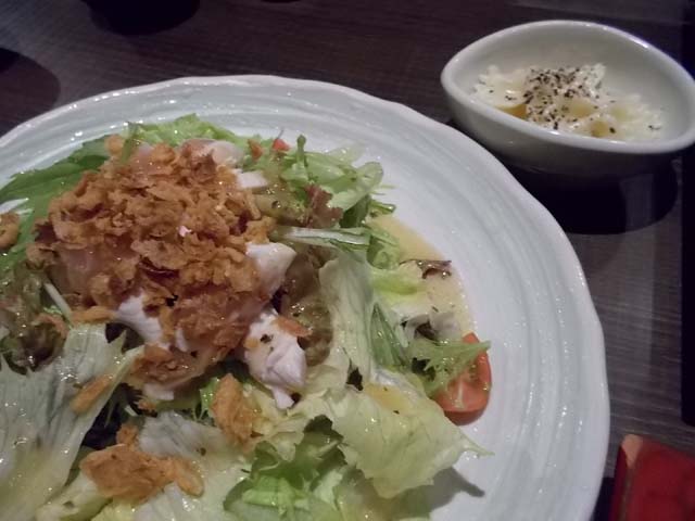 まずはサラダから。鶏のタタキが乗っていて美味。