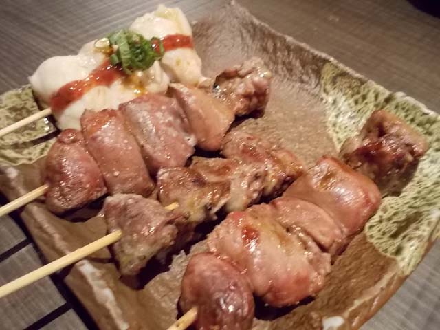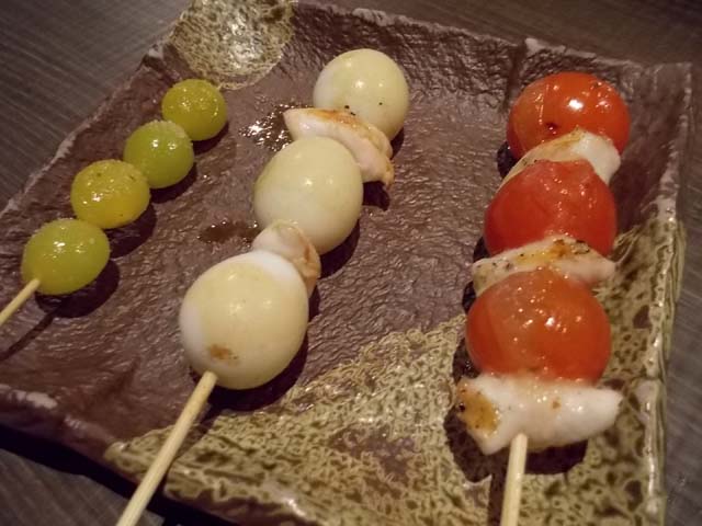 カミさんが大好きなつくねを4本(月見、わさび、チーズバジル、ゆず胡椒)。