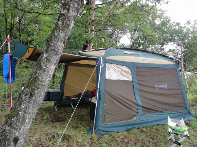久しぶりにコールマンのスクリーンタープとGIコット登場! 11時に着いて12時に設営完了、昼食は焼きそば&ビール。