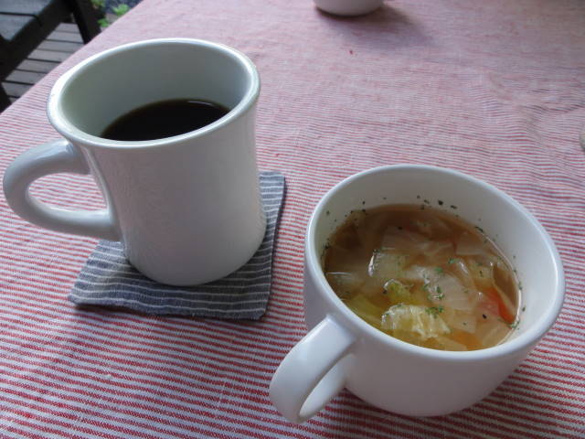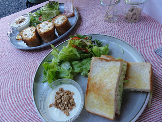 湿った物を干している間に、車で10分ほどのカフェで朝食。