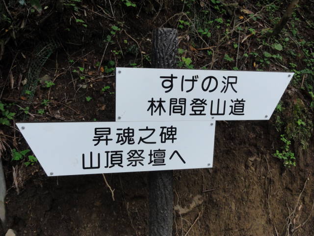 入山して10分ほどで、「昇魂之碑」と「スゲノ沢」の分岐点に到着。