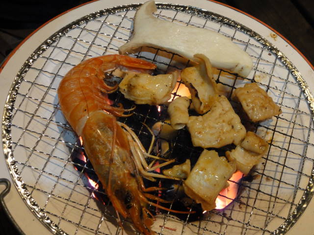 ホルモン、豚カシラ、赤エビ、エリンギ。最後にサンマも焼いたけど、写真撮るのを忘れました。(笑)