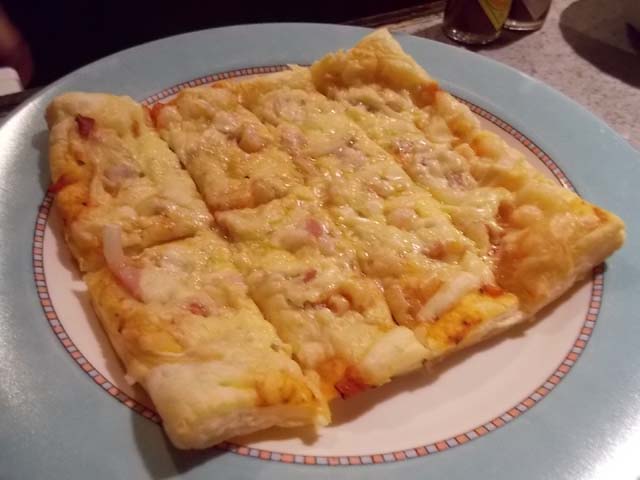 当初の目的だった当時の店員のその後を訊いて、よく食べていたパイ生地のピザとビール飲んで撤収。