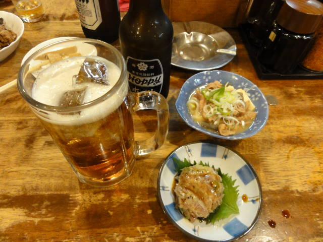 煮込みとセンマイ刺で、またしてもホッピーをグビグビ。ここでも中×2を追加。