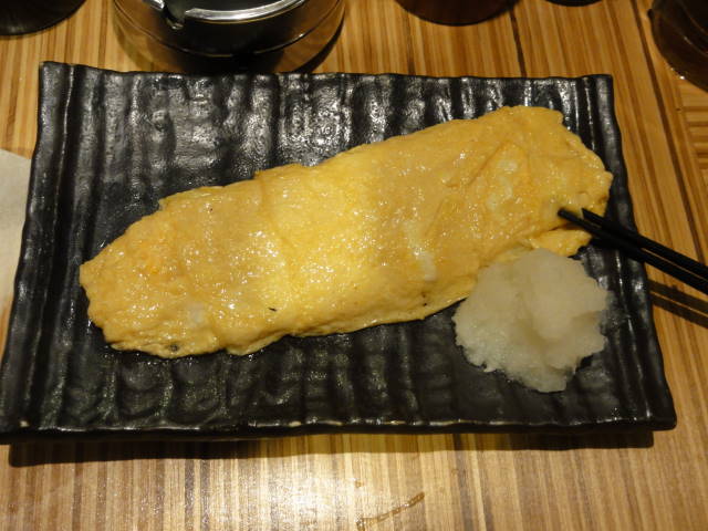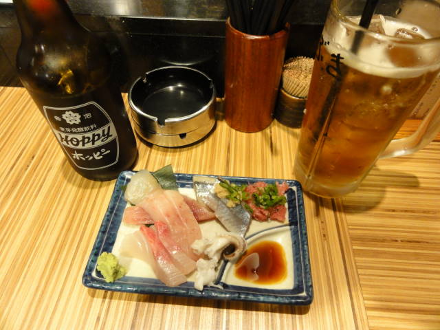 刺身の盛り合わせとガーリックシュリンプとオムレツで、またまたホッピー(ここでも中×2を追加)をグビグビ。