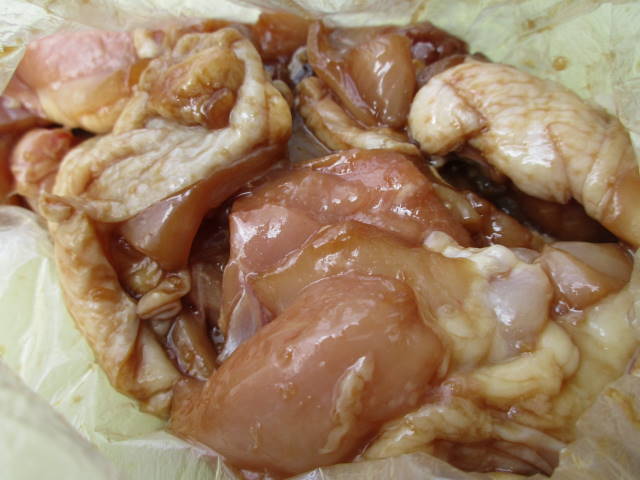 オリジナルと言っても手の込んだタレ等ではなく、一口サイズに切ったモモ肉に、すりおろしニンニクと醤油とゴマ油を絡めて、冷蔵庫で一晩寝かせるだけ。