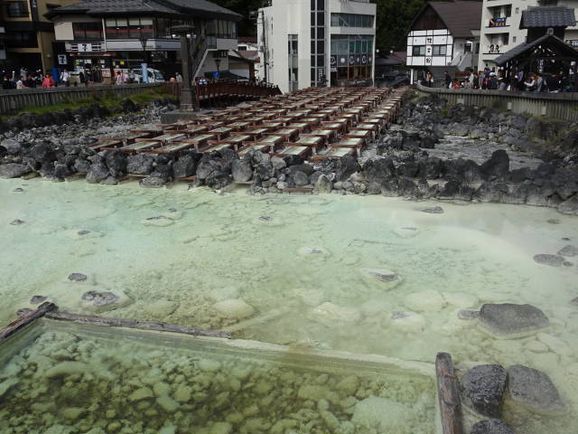 無料駐車場に車を入れて、歩いて「西の河原公園」を抜けて「湯畑」へ。