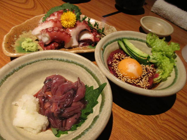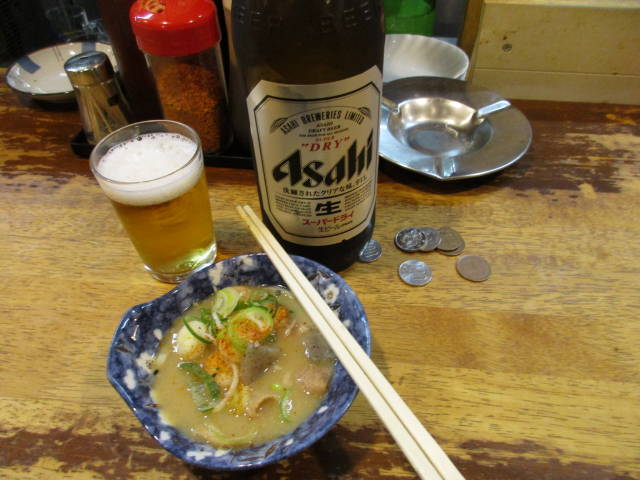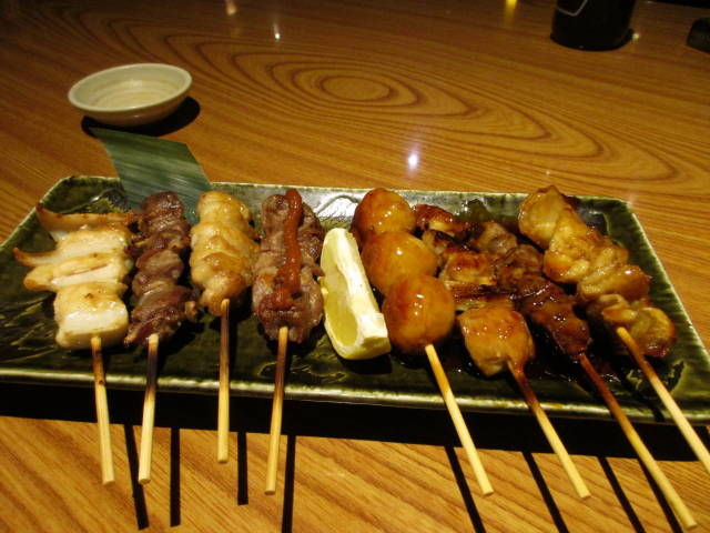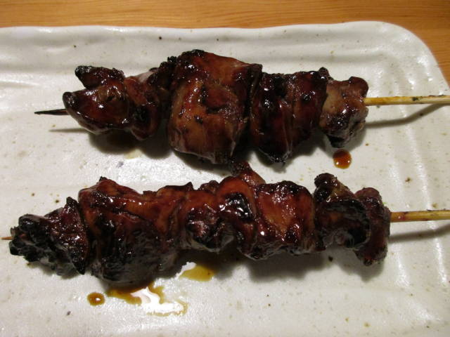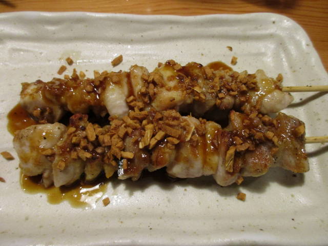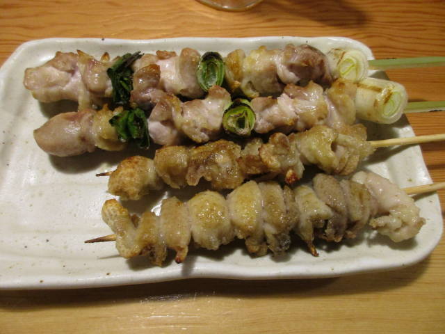 煮込み食べながらビール飲んでたら、隣のオジサンから「電車の時間になっちゃったから、これ食べて」って言われて、げそわさと焼き物3本もらいました。